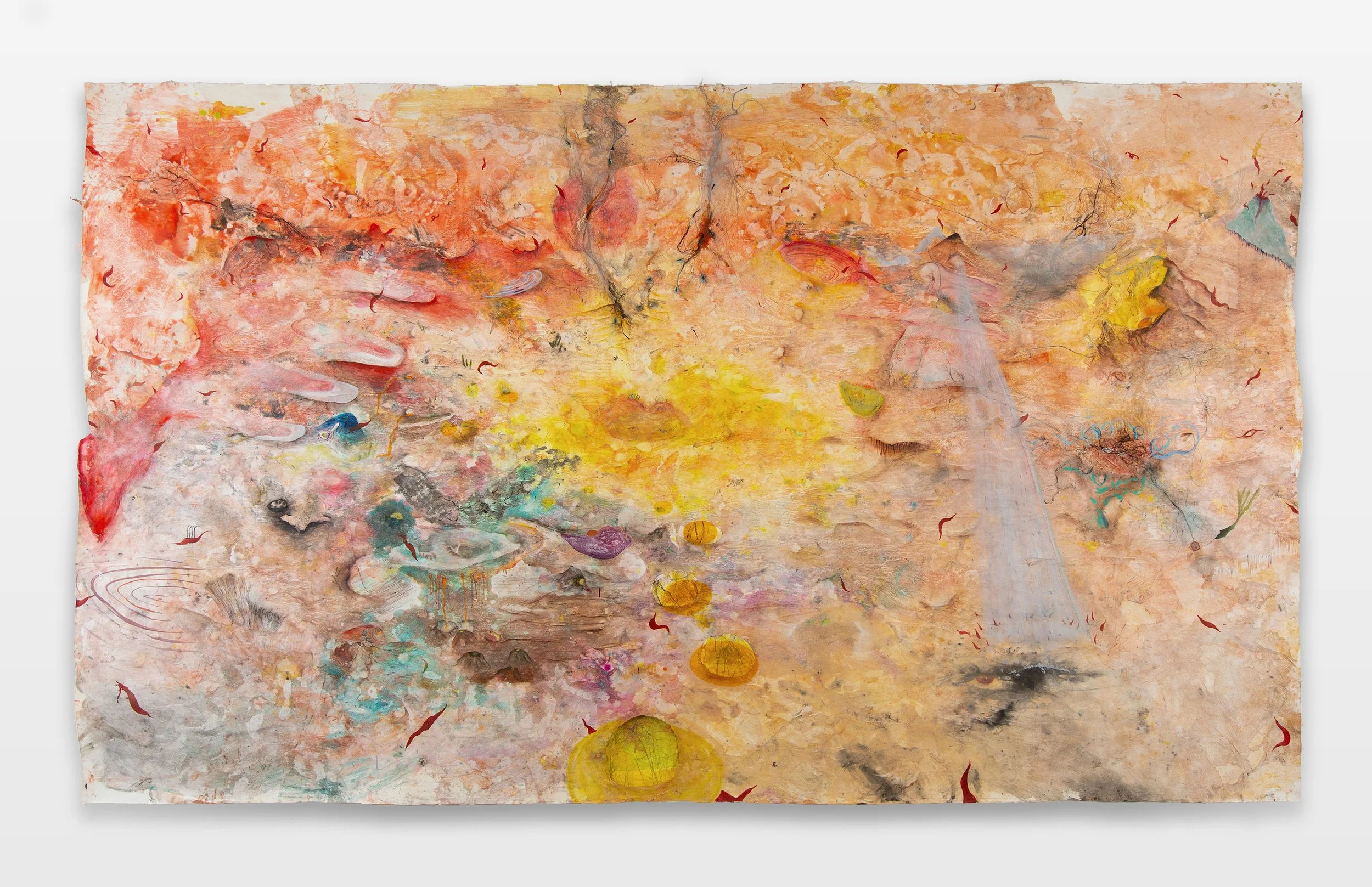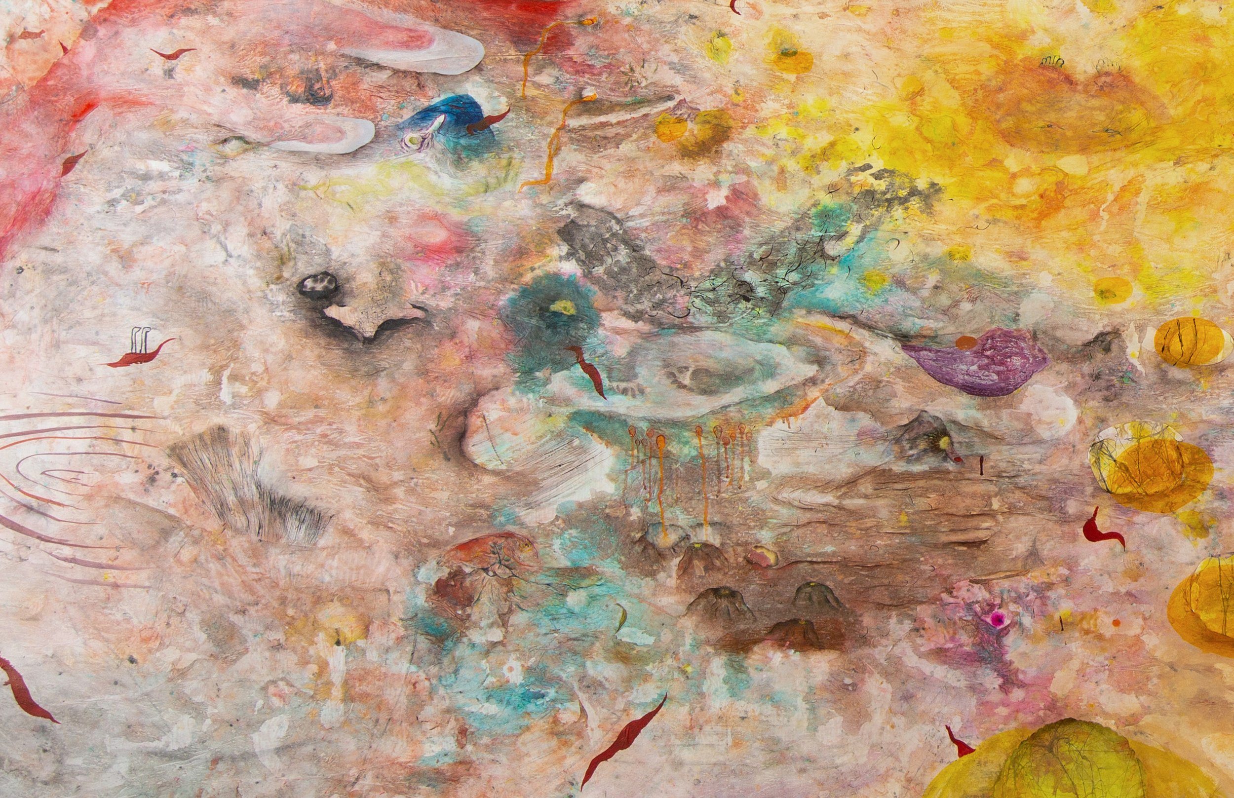 Ink, watercolor, soft pastels, glue, acrylic, graphite, hair, sand, paper on paper