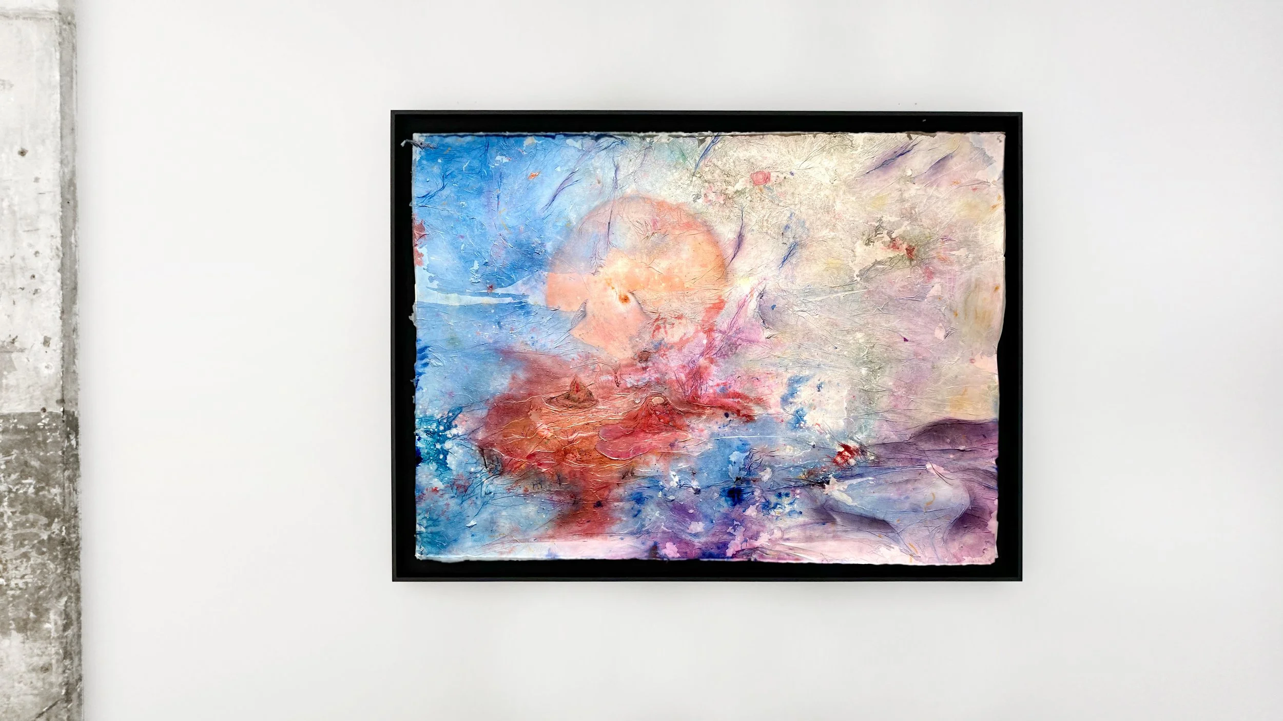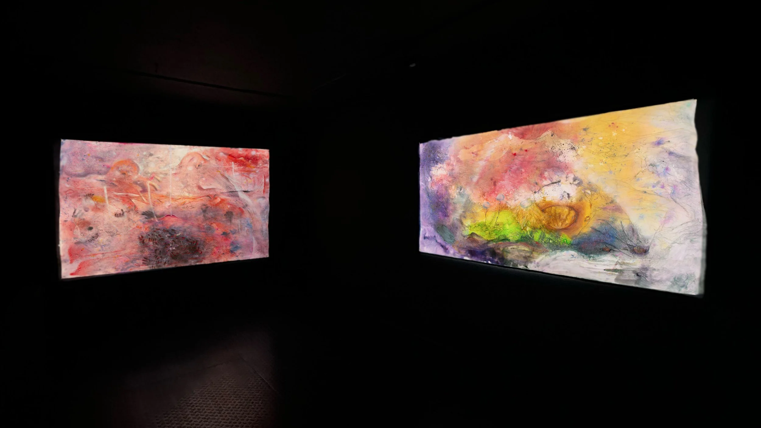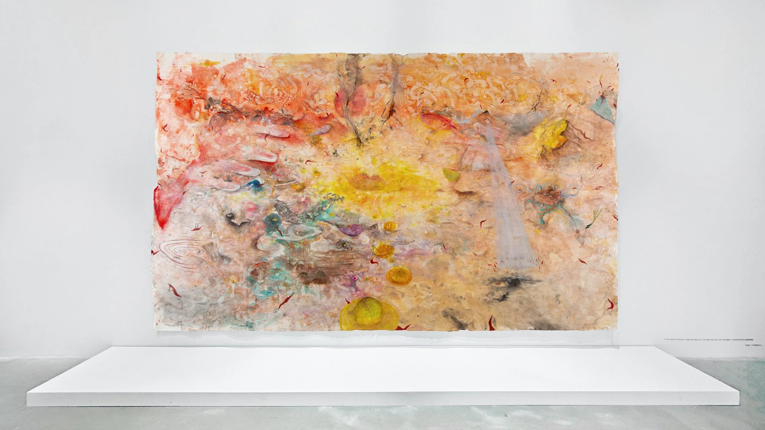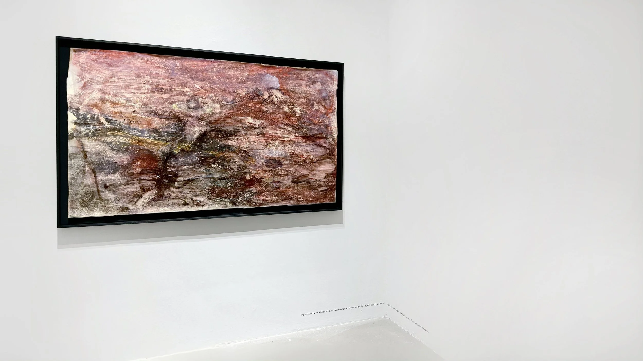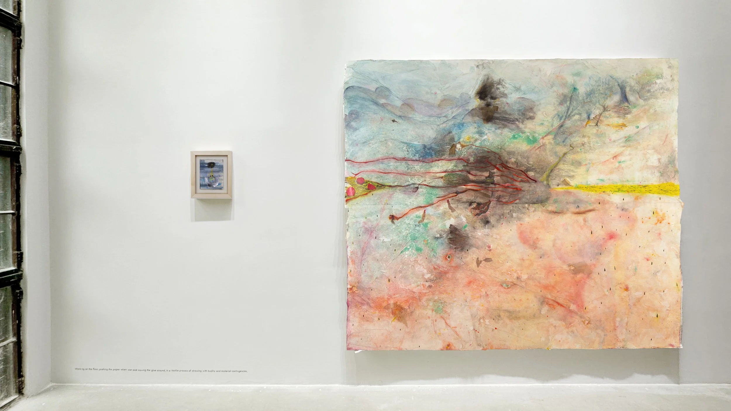 The almost human size painting indicates a sense of immersion. Observers tend to fall in the illusion of a sweet and light landscape painting from the far. However, the closer they get, the more they realize the essence of the work – the carrier of the artist subconscious is not canvas, which is commonly used, but paper, fragile and brittle. Paper can breathe, through the unique textures and holes left by minced and flattened plant fibers. It allows the watercolor to flow naturally and aimlessly. Layers of layers of paper curled up as the watercolor passes - building undulating features. The paper was constantly cut, tear, crumpled and smoothed by the artist. However violent as it may sound like, the artist was gentle and restrained. Traces are too minor to notice, lost in the enormous color field, undetectable. Tissue paper are stick to the base by gelatin-mixed paint, covering up the essentially unnoticeable traces. Wrinkles are inevitable, like paper scars, silently shouting the hurt from the past.